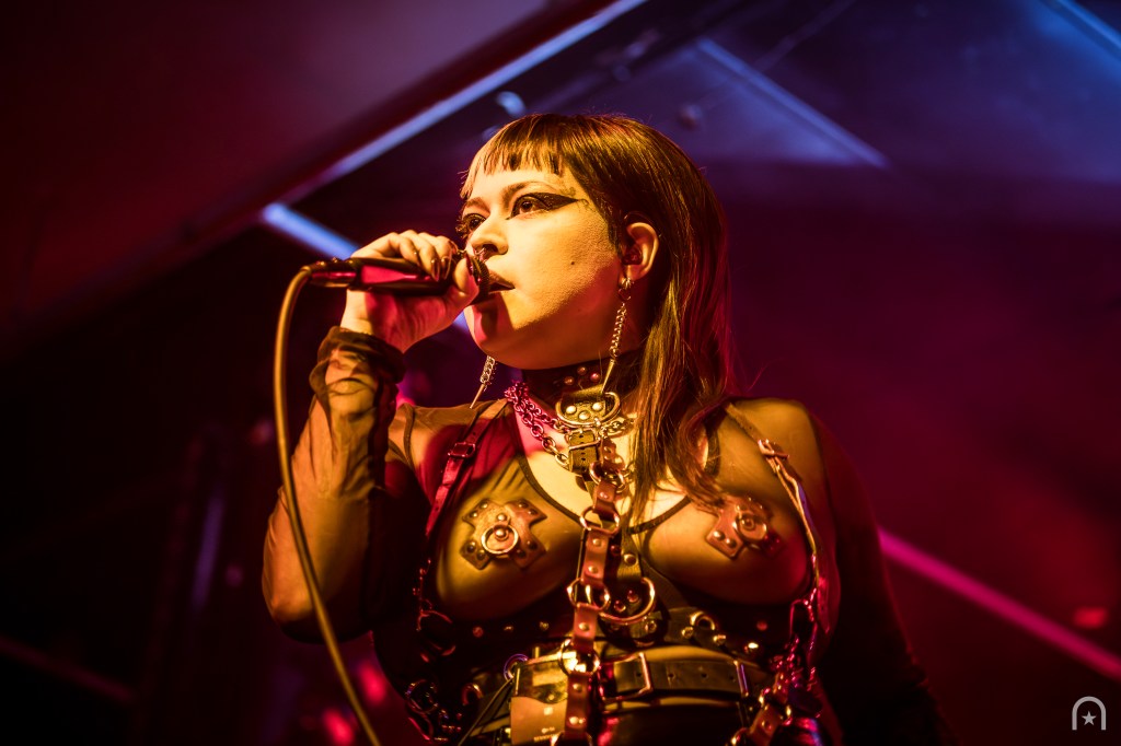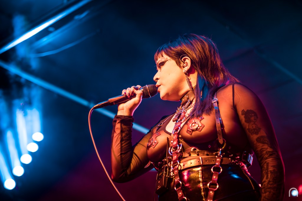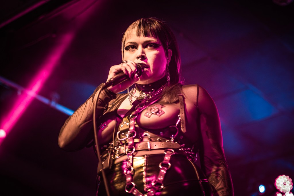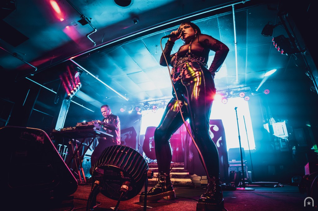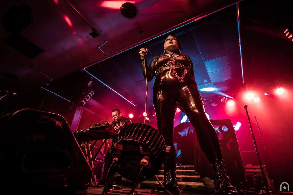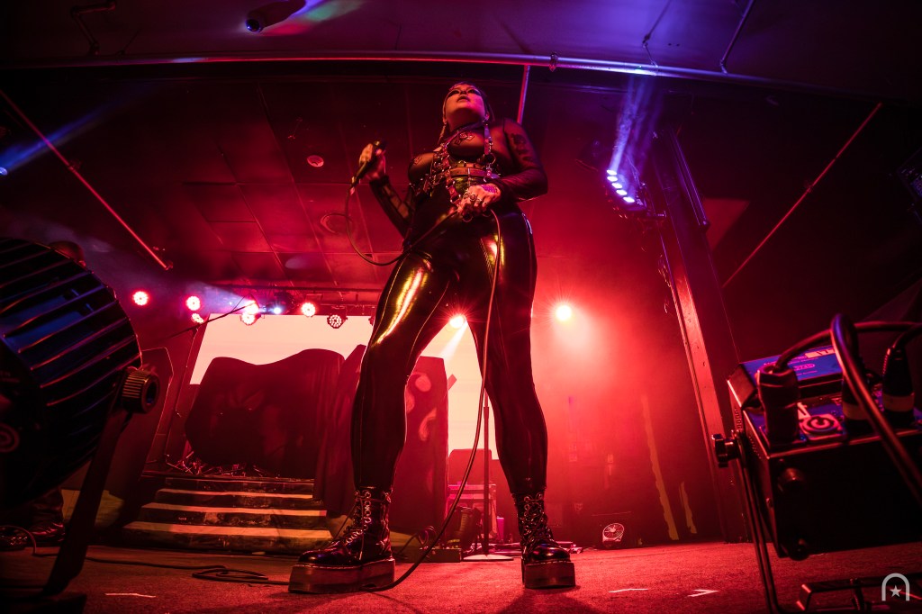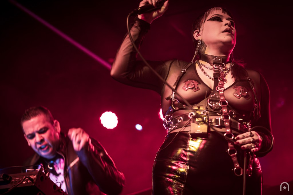 Shortly after, the stage was cleared for the Los Angeles-based dark electronic duo, Die Sexual. They were an act I was hoping to see earlier this year at Dark Force Fest but missed out. Their set consisted of a continuous pulse-pounding beat from beginning to end. If the crowd wasn’t warmed up before, they were now. Frontwoman Rosselinni, struts the stage with fierce authority while Floriano keeps the pulverizing beats coming.
